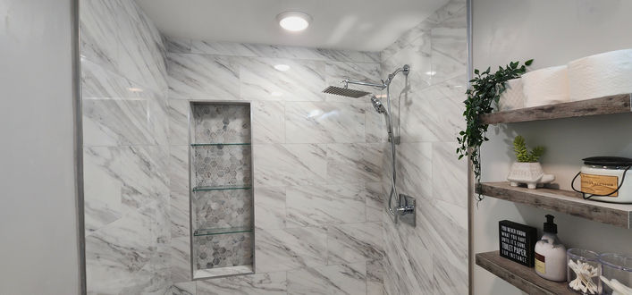 A full bathroom transformation featuring custom tilework, a walk-in shower, and modern fixtures—designed for relaxation and built for functionality.